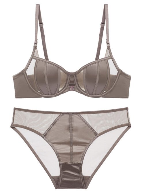 Taupe Mesh Panel Front Open Underwire Bra & Panty