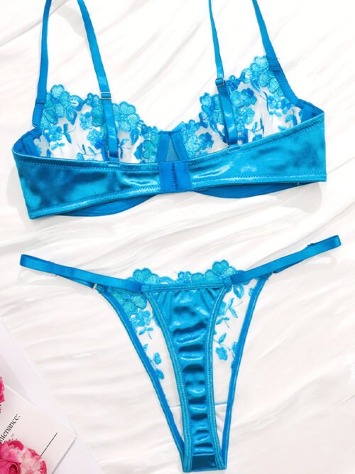 Blue Floral Embroidered Lingerie Set – Sheer Mesh Underwire Bra & Panty