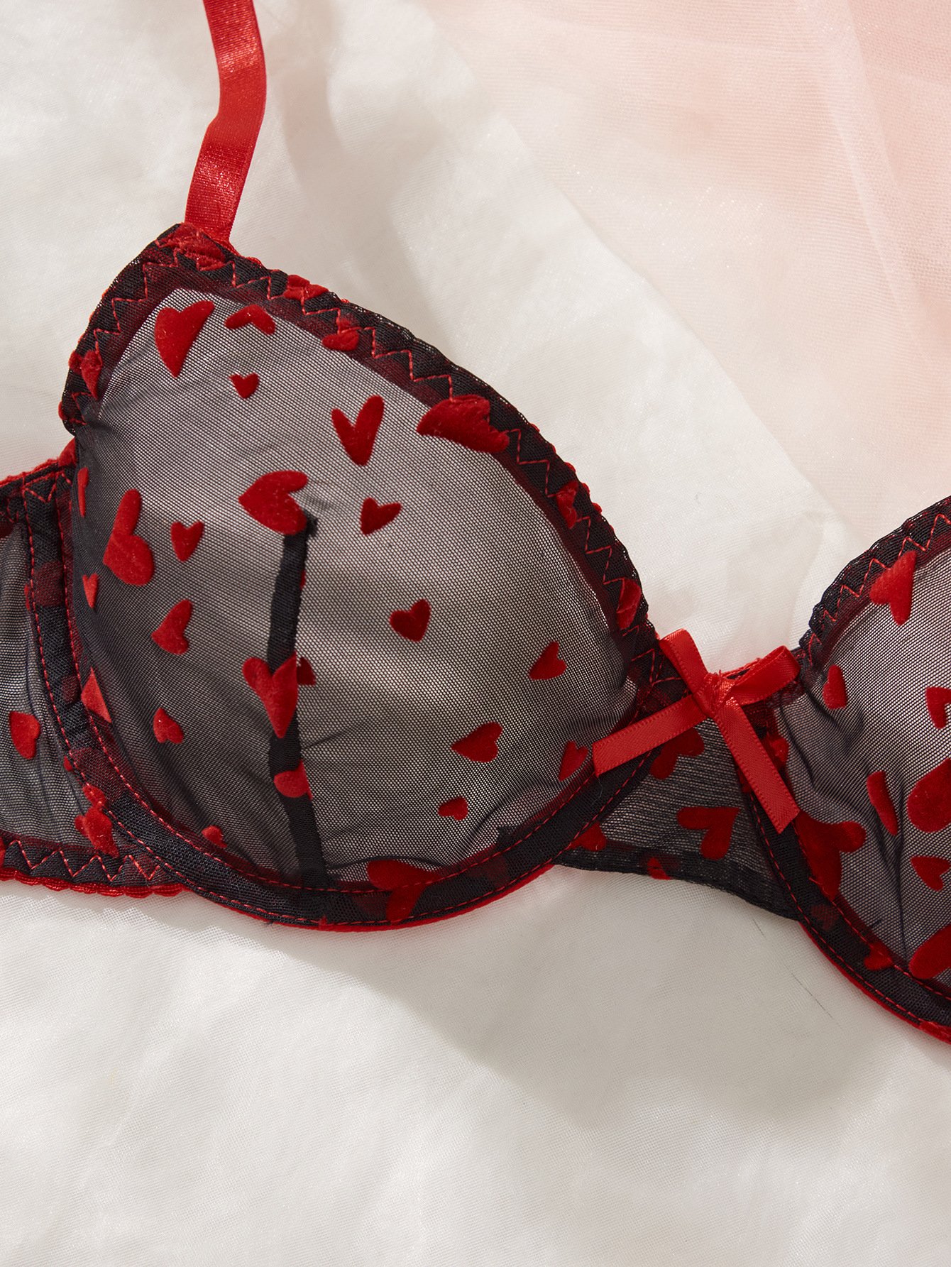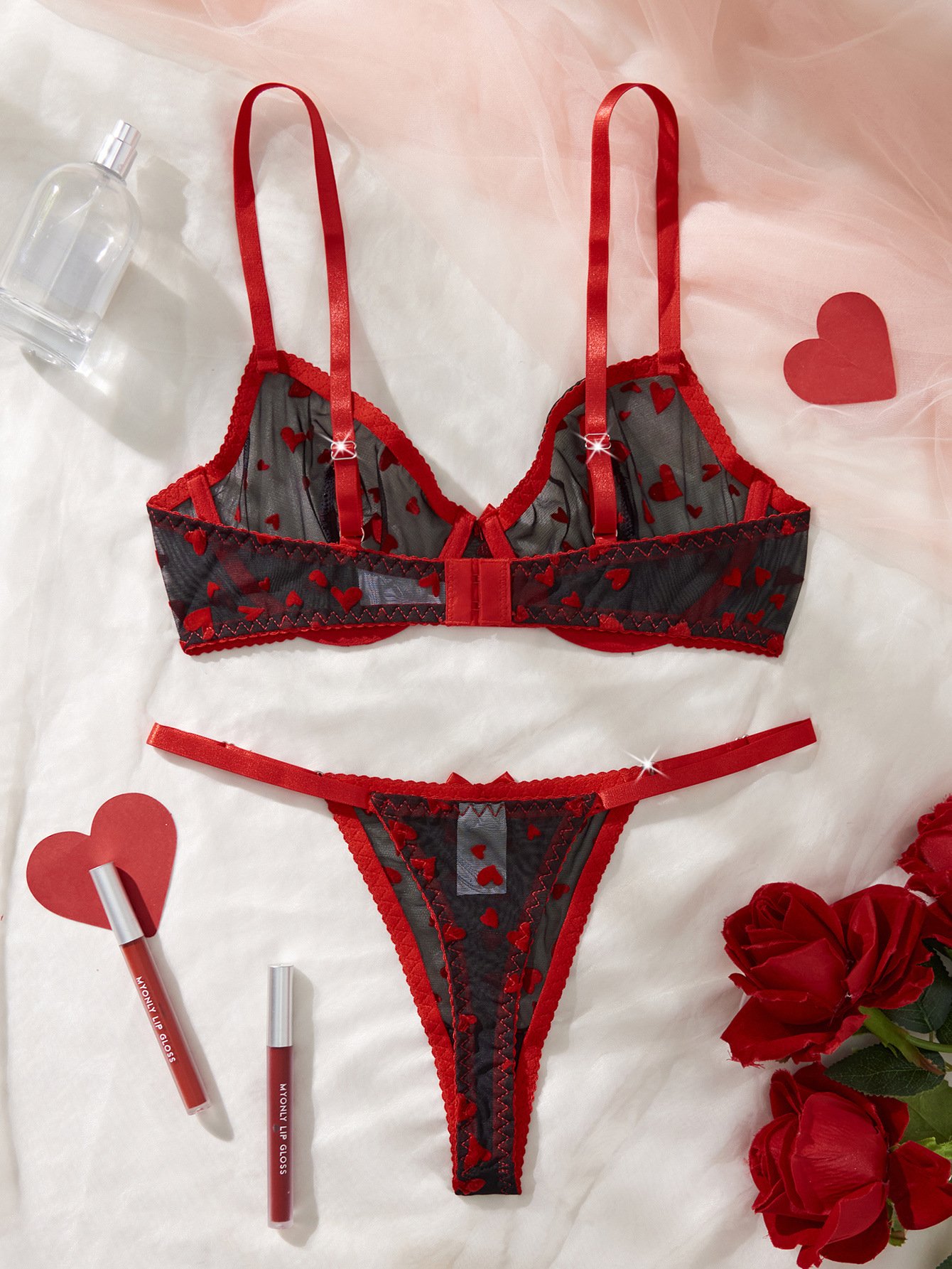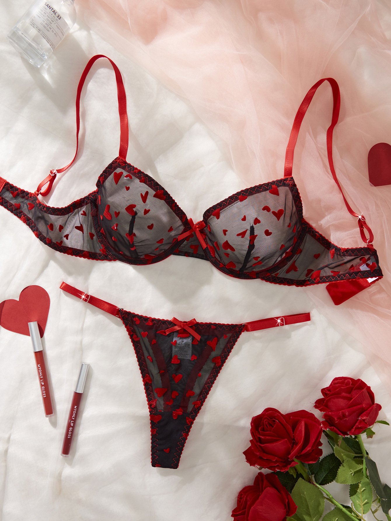 Black Sheer Mesh Heart Embroidery Lingerie Set – Romantic Underwire Bra & Thong